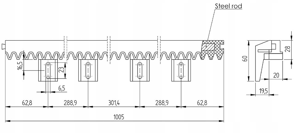 Listwa zębata nylonowa rdzeń met. M4 1szt=1m MAX 800kg